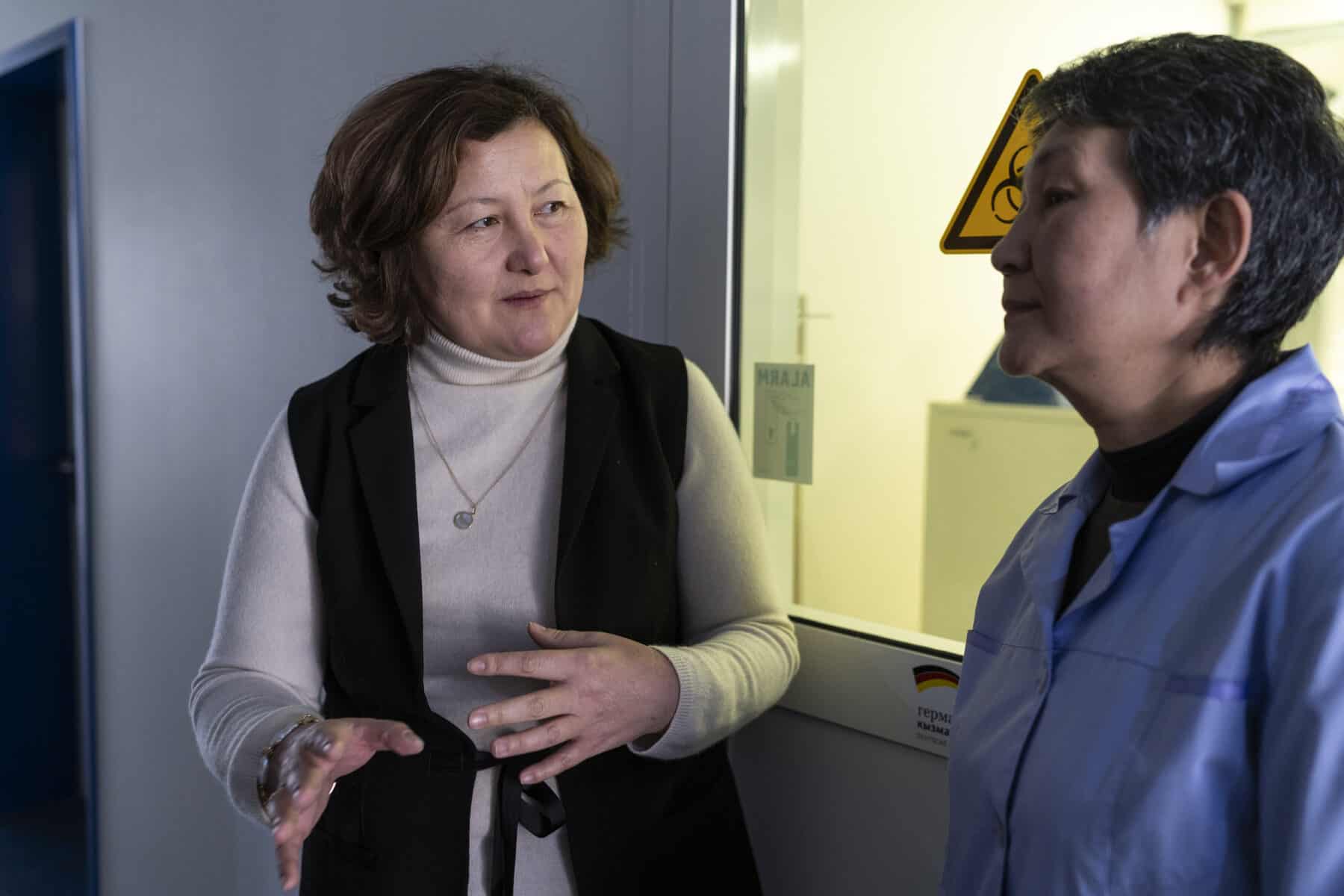 Dr. Gulmira Kalmambetova discusses partnership, teamwork, and shared commitment to ending TB in the Kyrgyz Republic with NRL staff Altyn Iskakova. Credit: Yam G-Jun.