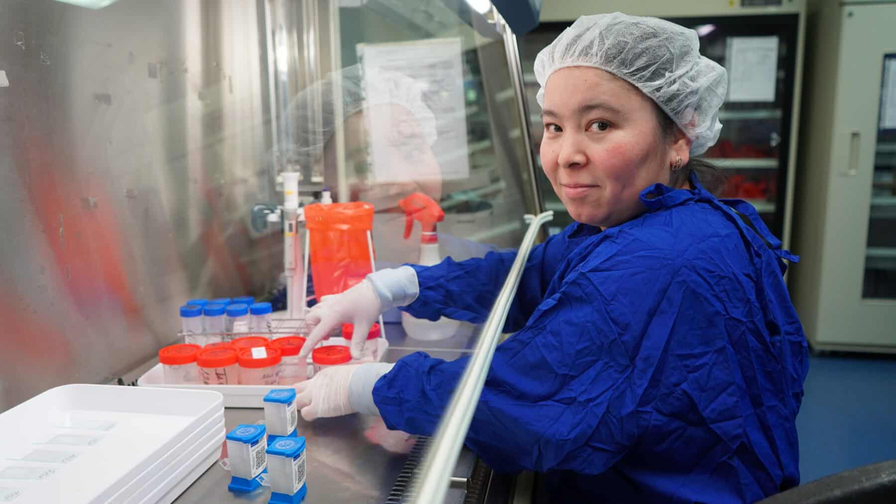 Laboratory specialist Nurjamal Jakypbekova at the NRL prepares TB specimens for molecular testing inside certified biosafety cabinets. Credit: Aibek Chakiev.
