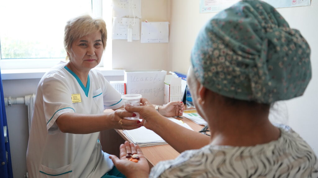 A family nurse at a primary health facility gives a daily dose of TB drugs to a person with TB at a Family Medicine Center in Bishkek, Kyrgyz Republic. Photo credit: Aibek Chakiev for JSI